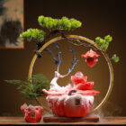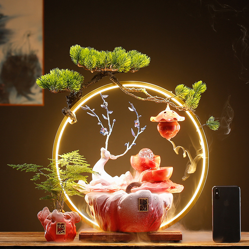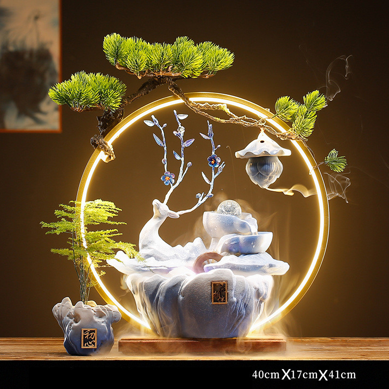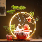 This ceramic deer fountain features flowing water, soft lighting, and a tranquil forest aesthetic. Designed as a tabletop fountain, it brings gentle movement and sound to indoor spaces.